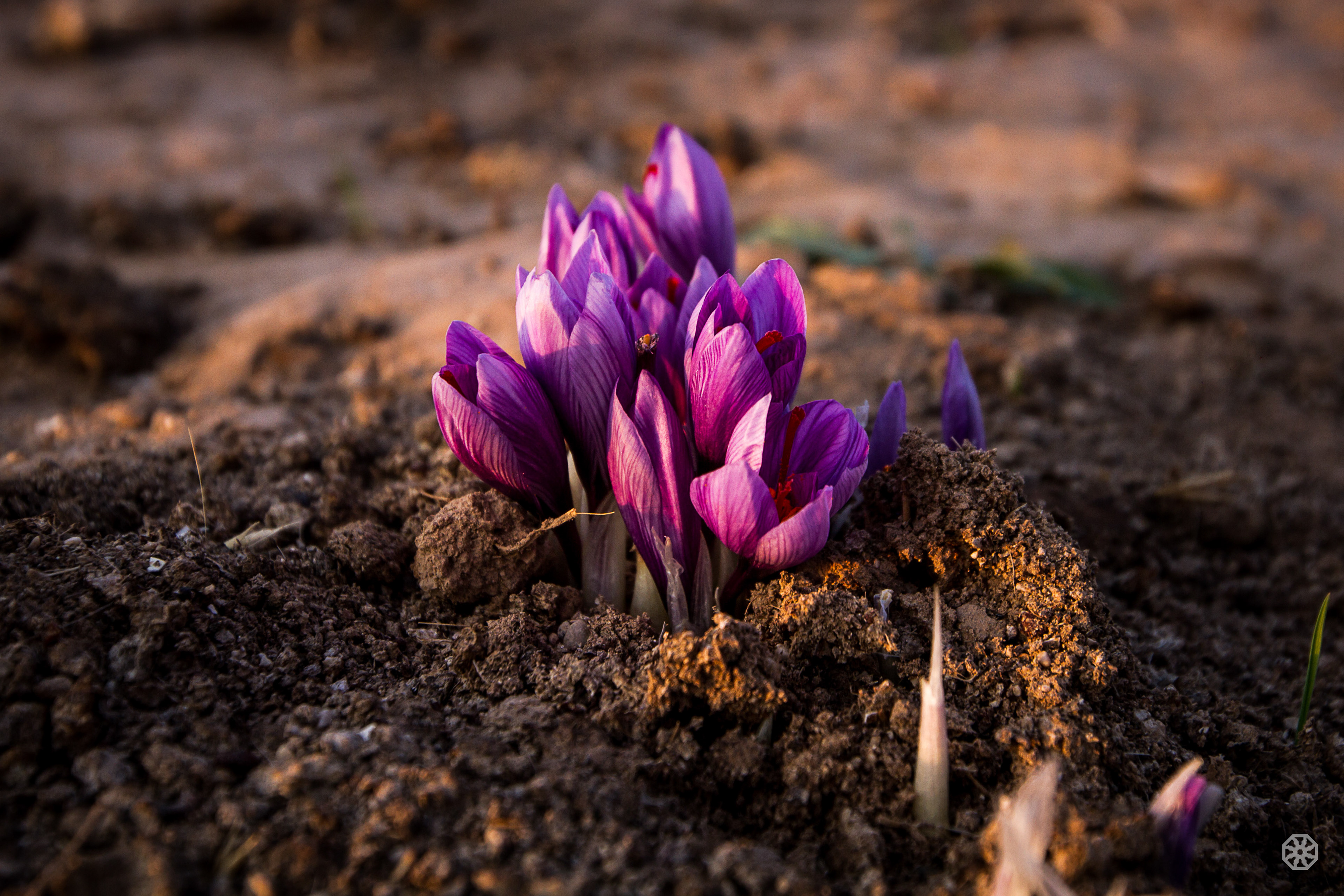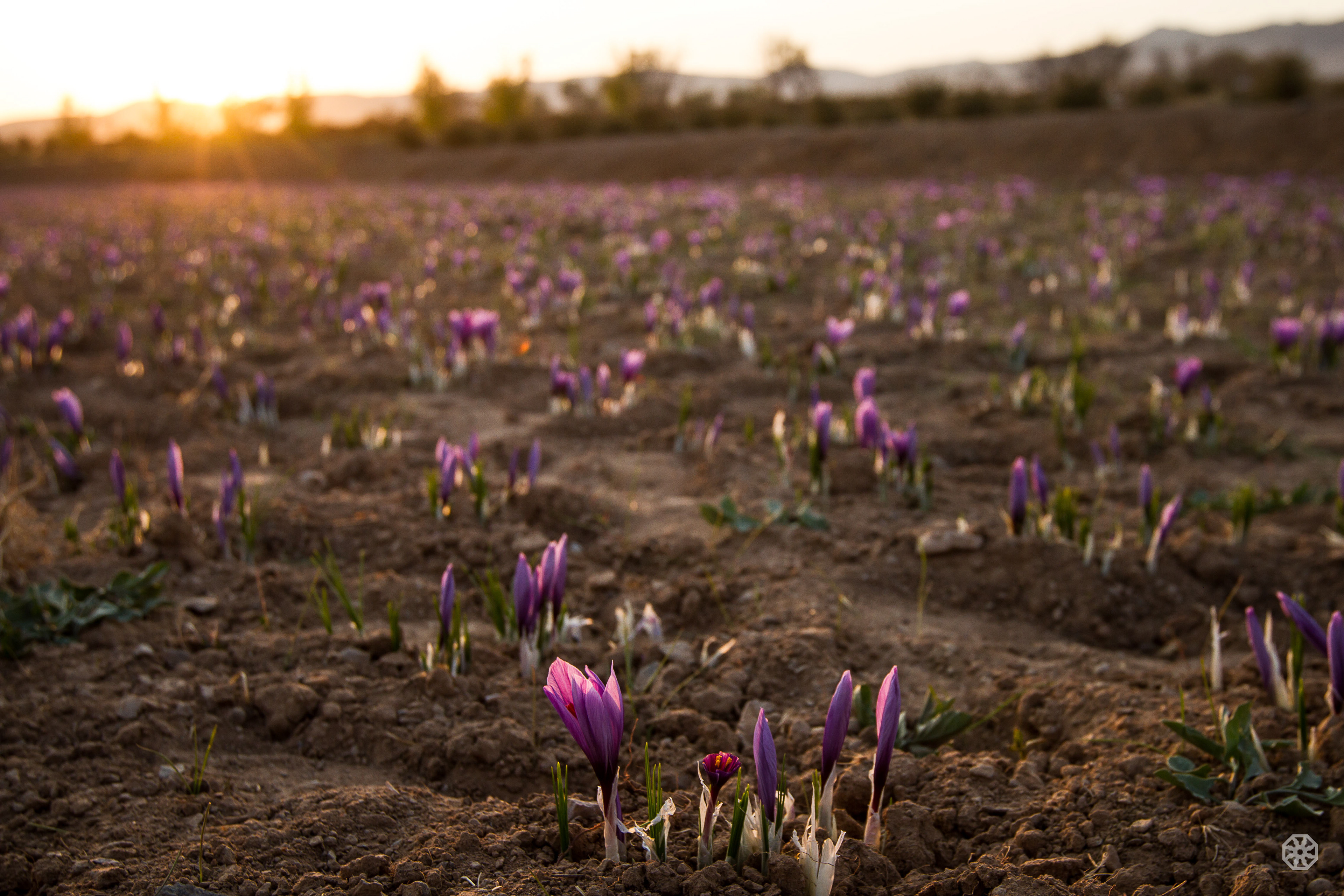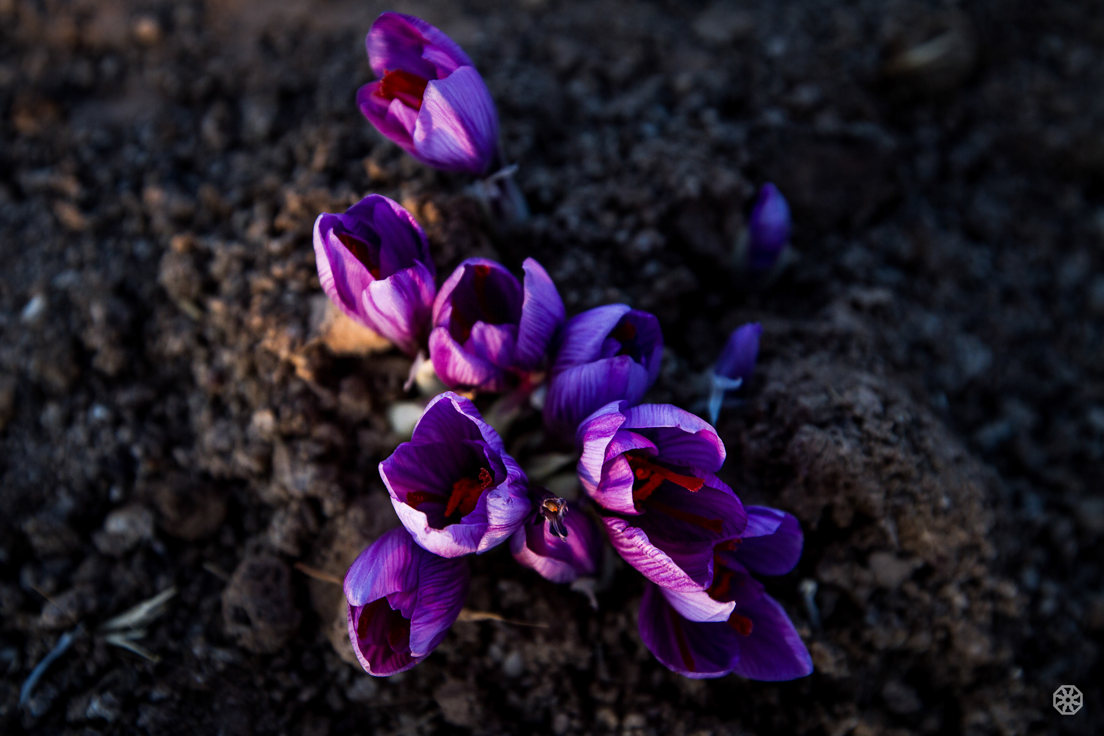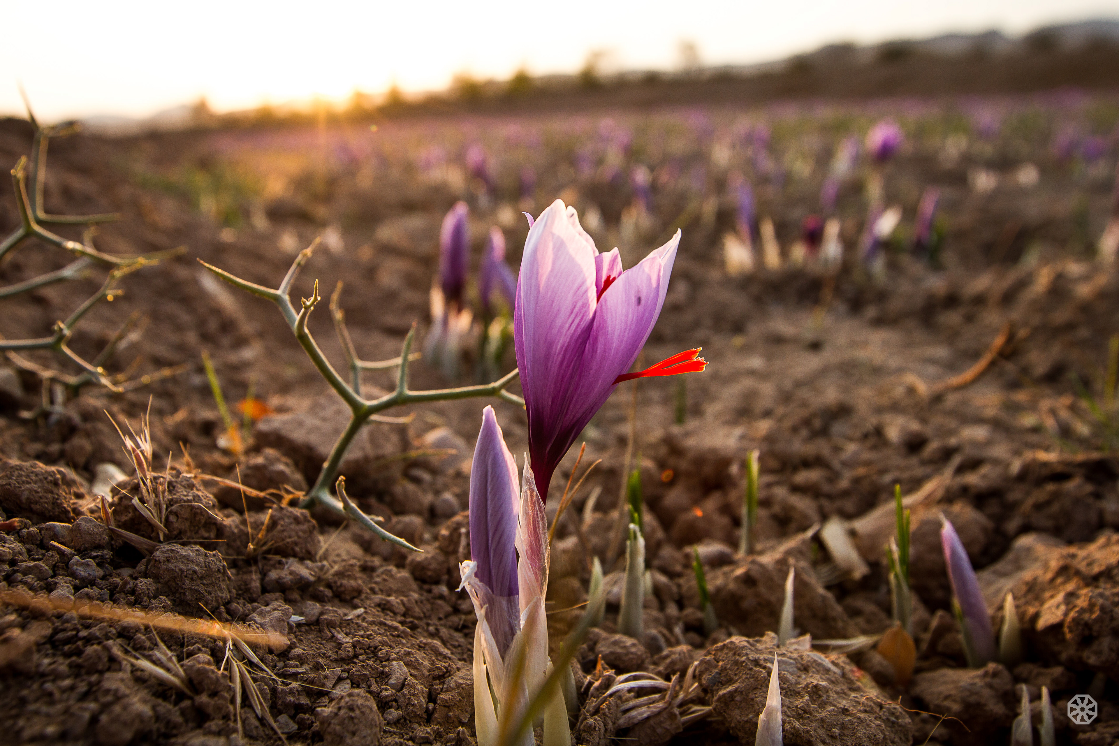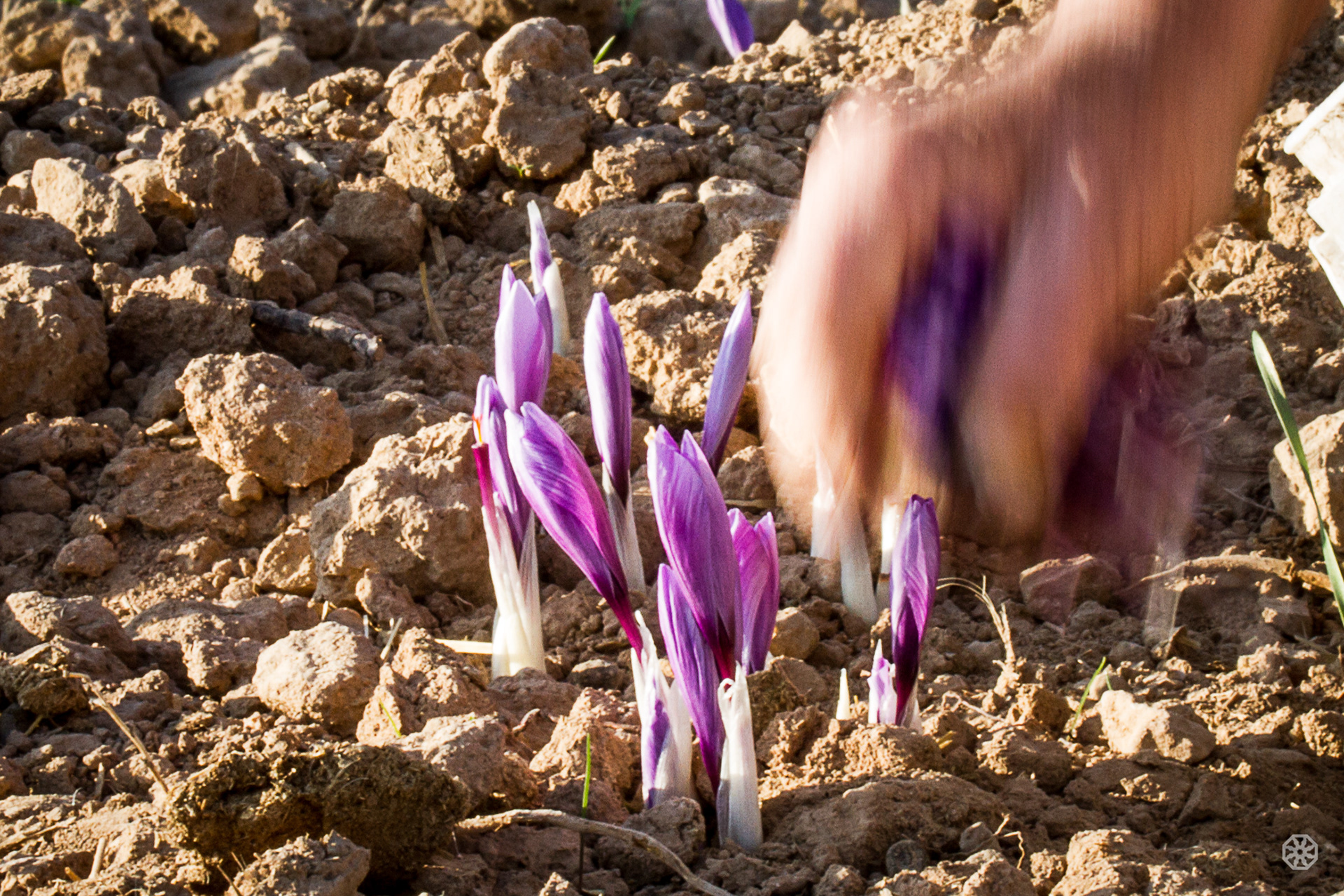 Le vent chaud, chargé de senteurs résineuses et balsamiques, fait danser les fleurs de crocus, s’étourdit dans leur parfum de lys, et étreint par surprise le cueilleur contemplatif. Leur vie ôtée aussitôt épanouie, leur haleine se mue peu à peu en une aura poudrée et amandée. Puis, à leur tour, les stigmates laissés par le temps s'envolent pour un voyage aride sans retour, qui les verra renaître en un phoenix rubis et ardent, métallique et puissant, nommé safran.