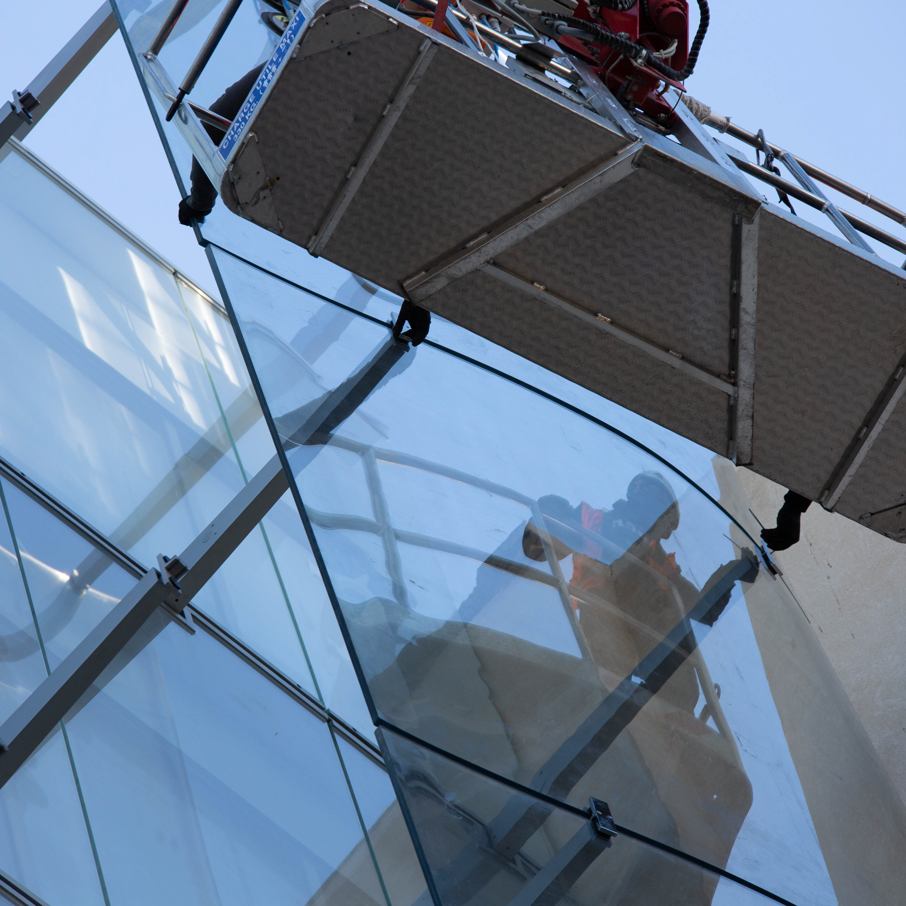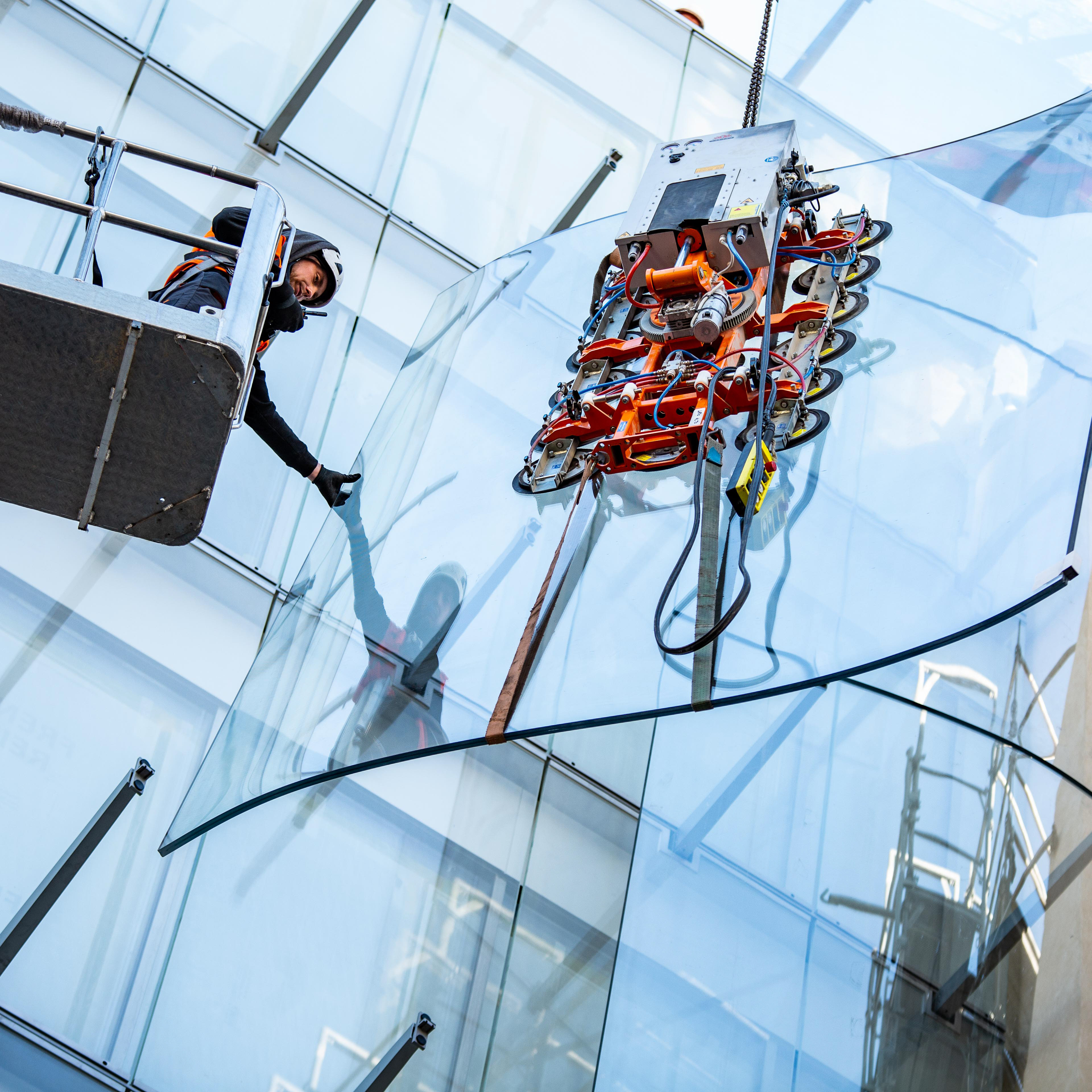 Revêtement du rideau de verre de la façade du bâtiment Rivoli, par Frener & Reifer, qui est responsable des études, de la fabrication et du montage de la façade ondulée à triple coque du magasin.